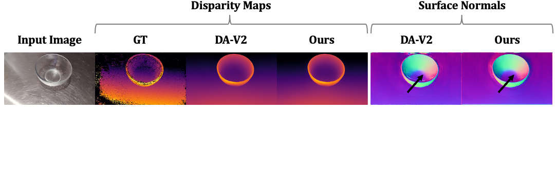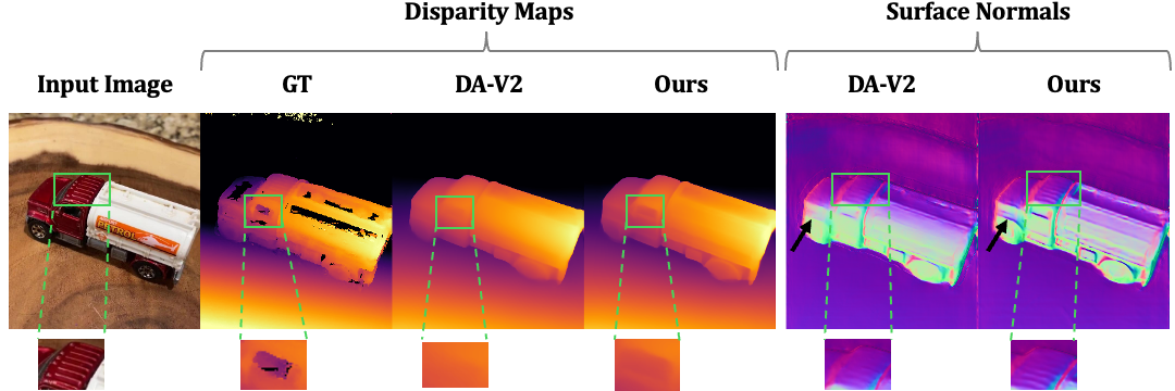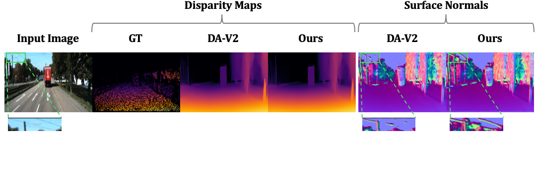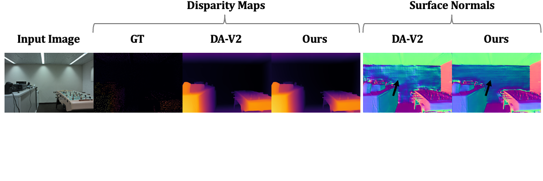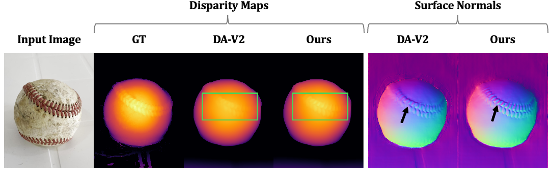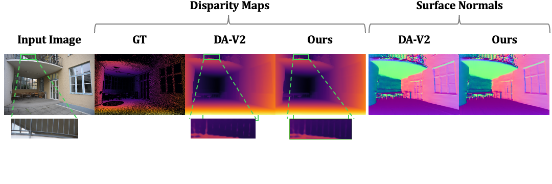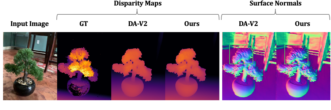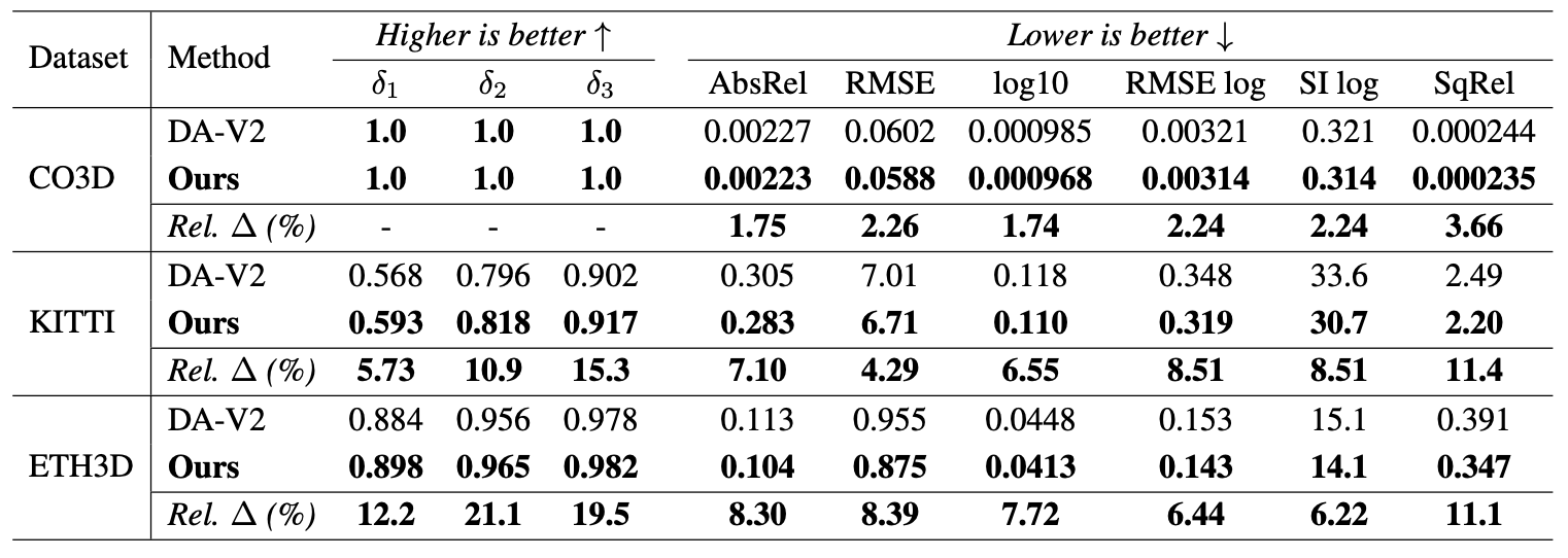 Comparison with DA-V2 across datasets. Relative error reduction of Ours over DA-V2 is shown in the last row of each dataset.