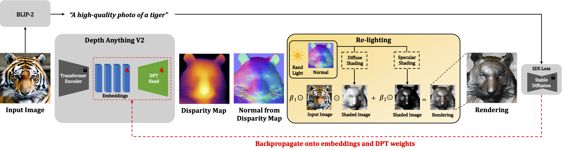 Our main contribution is the re-lighting module that randomizes light conditions and shades the estimated geometry on the input. Notably, the re-lighting does not need to look physically accurate as we are only augmenting not photometrically reconstructing the image.